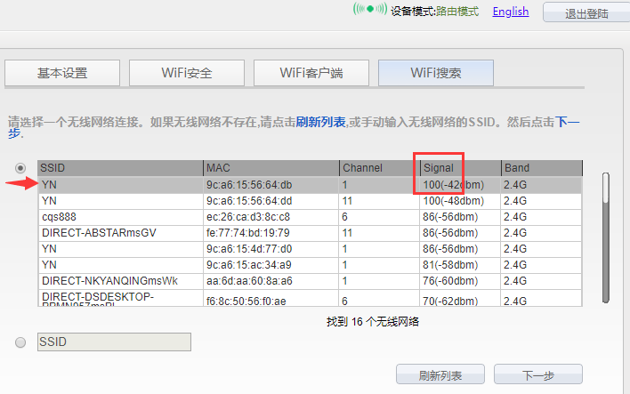 (2)选中需要连接的上一级热点。注意:请选择信号强度值高的WiFi热点连接(Signal列下数字越高,信号强度比较高的)。