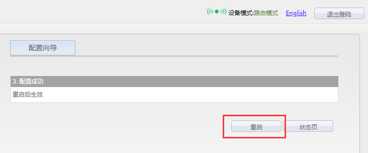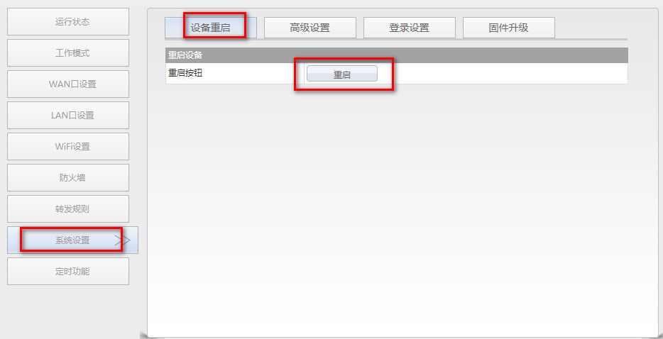 3. 重启设备:切换到“系统设置”下的[设备重启]选项卡,点击“重启”按钮,所有修改项将会生效。
