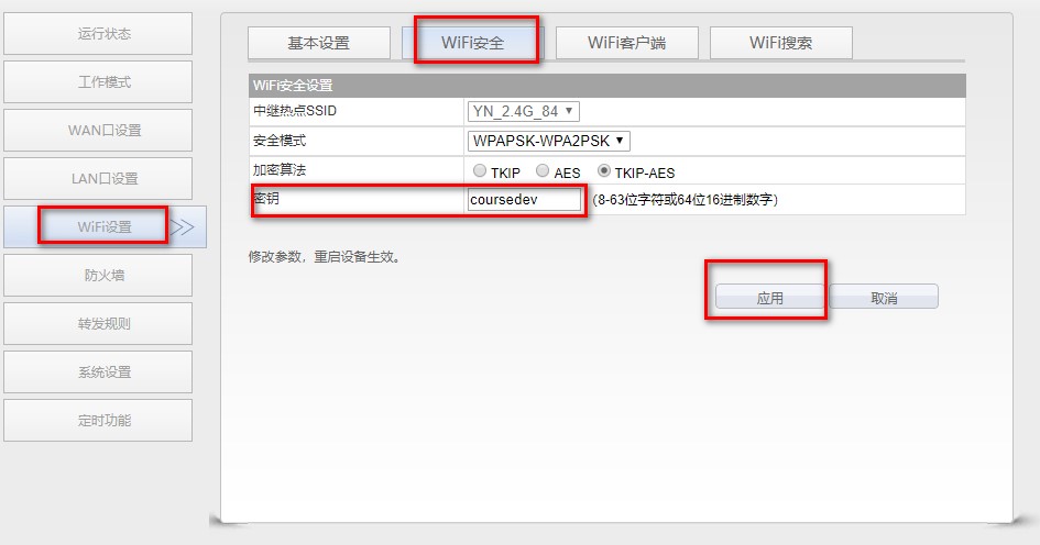 2. 更改WiFi密码:在“WiFi设置”里选中“WiFi 安全”,在密钥后的文本框输入新的WiFi密码,点击“应用”按钮;